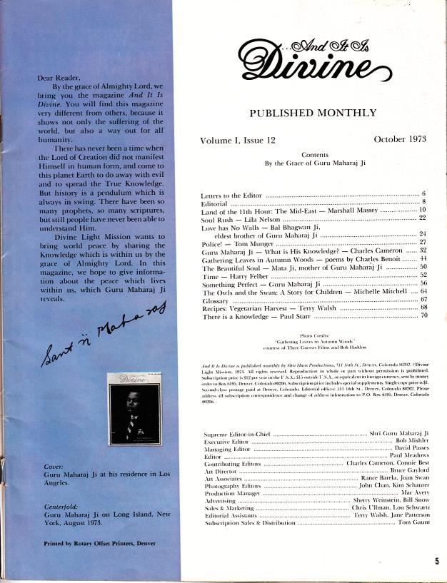 and ended the same as all other Divine Light Mission magazines printing pictures and speeches of Prem Rawat's or his immediate family or close followers.