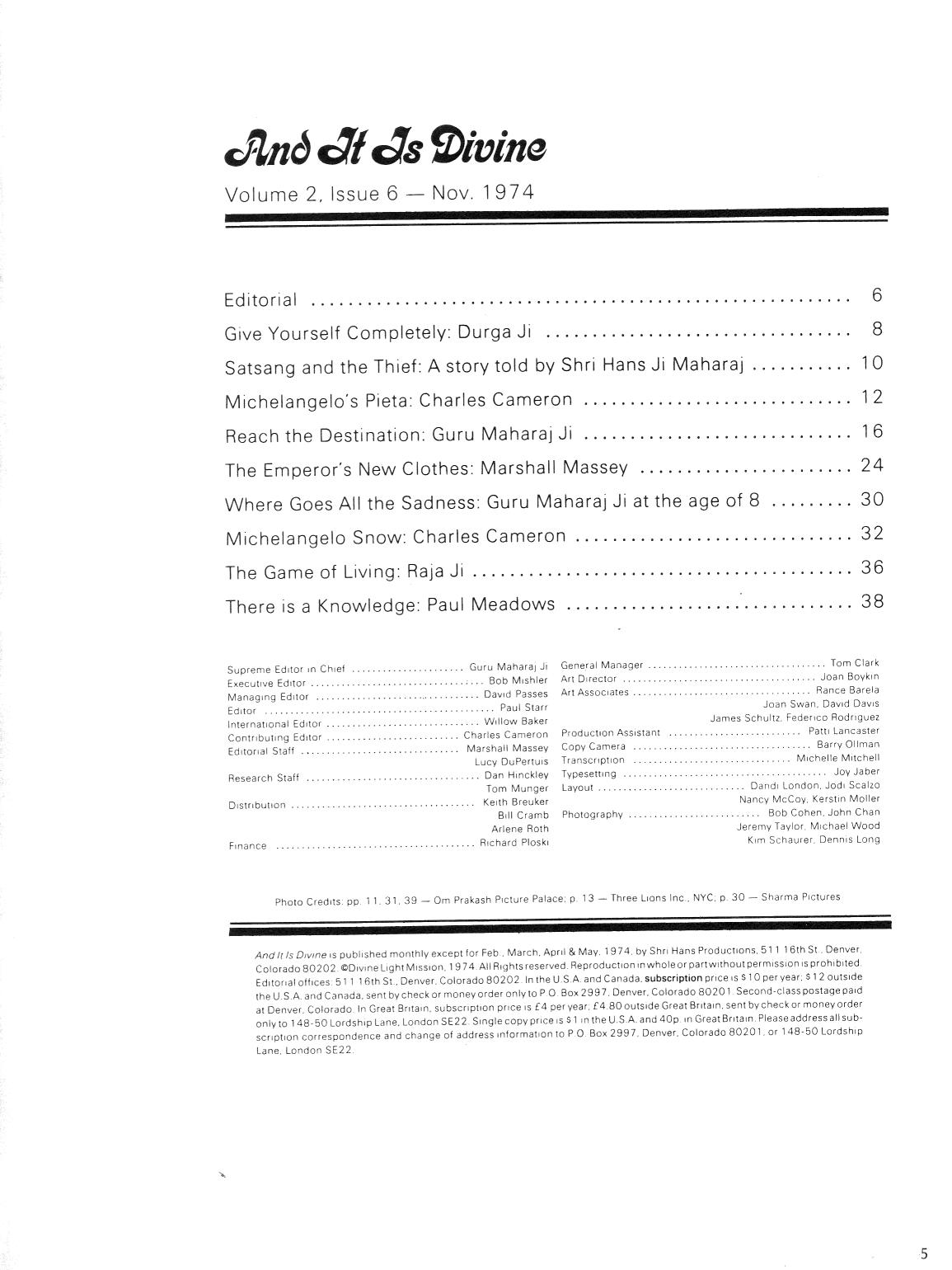A person may spend his life searching the whole world over for something which will give him peace. Yet he will die in despair if he fails to understand that the source of peace and truth isto be found right inside himself. Guru Maharaj Ji's Knowledge teaches us how to meditate on the source of peace and love inside us. It is not the sort of knowledge we can find in libraries, for it is a direct experience of something within us, not a theory. This meditation is shown to people by close disciples of Guru Maharaj Ji known as mahatmas. It is revealed free of charge to those who come with an open heart.