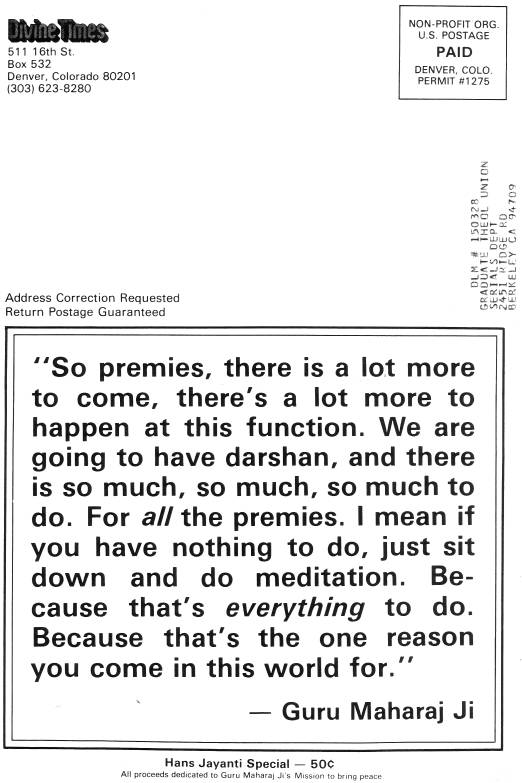 Guru Maharaj Ji sets before us the perfect example of what devotion and dedication really is. These are qualities we have never experienced before and we have no hold on them. We need that perfect example to be set before us. Every day of our lives, this same example is set before us. Maharaj Ji is constantly calling us forward on our path, and if we can only suspend our habitual state of disbelief - for even a second - Maharaj Ji is right there to help us up the next step. How many people in history have ever completely realized this peace? Yet this is exactly the course Guru Maharaj Ji is demanding that with every breath of our lives.
