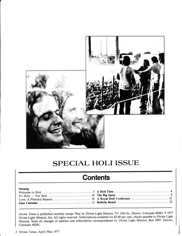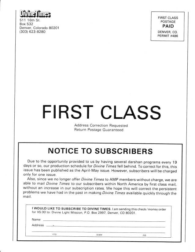 Due to the opportunity provided to us by having several darshan programs every 19 days or so, our production schedule for Divine Times fell behind. To correct for this, this issue has been published as the April-May issue. However, subscribers will be charged only for one issue.