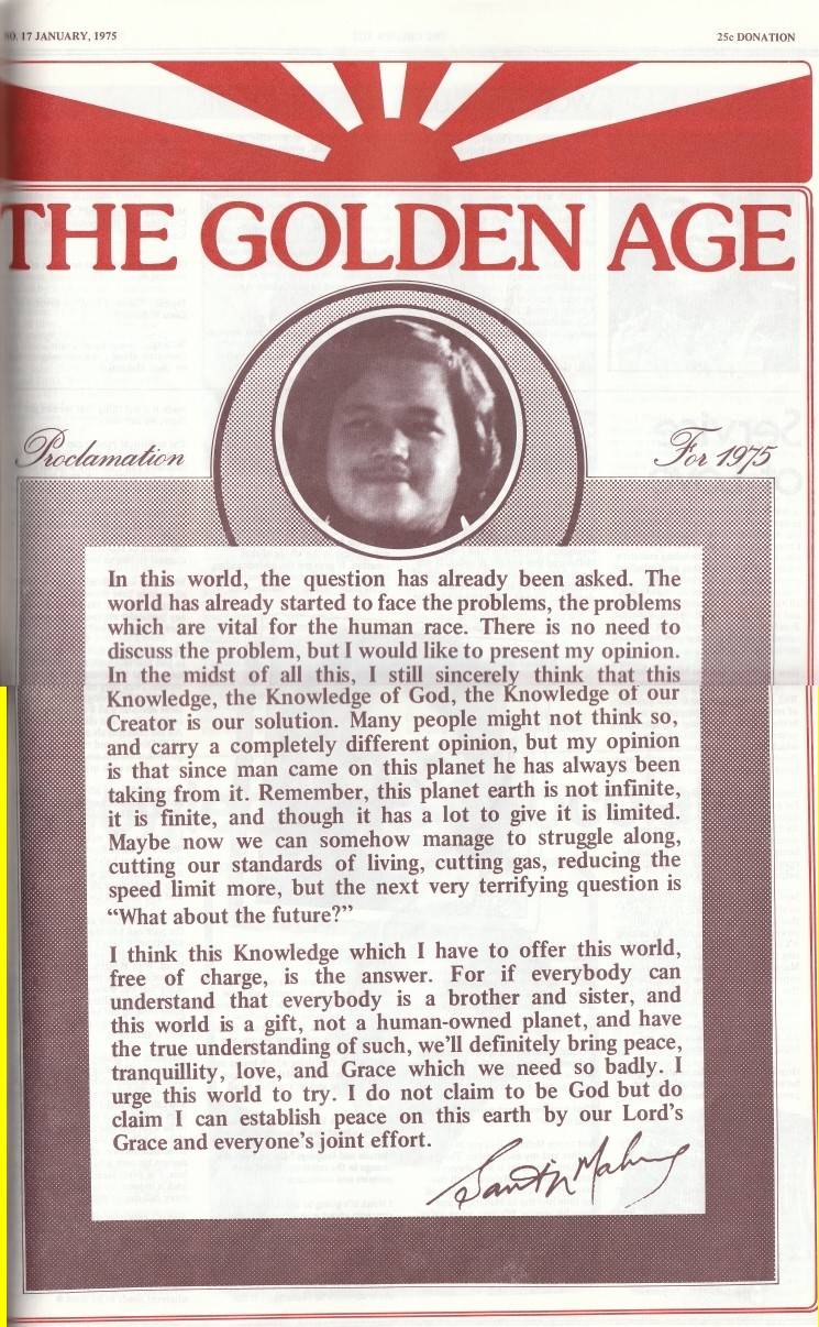 Guru Maharaj Ji has told Bob Mishler to outline a projection of DLM for 1975. This involved meetings with all department heads and ashrams. Questions are asked - what are your priorities? Does your service interfere with your realization of the Knowledge? Soul-to-soul discussions were held for a week between executives and premies. Stored emotions were released, problems discussed and love regenerated.