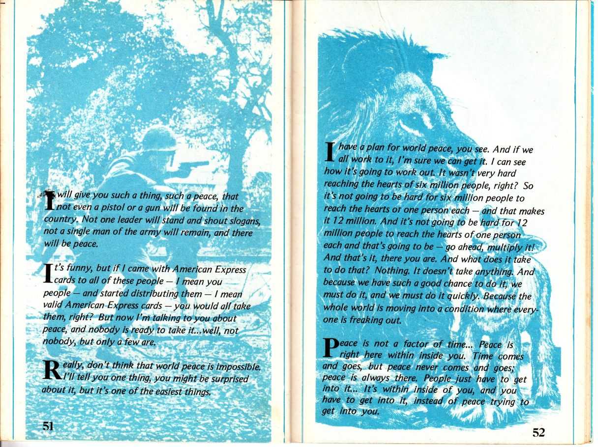 At last, a book of sayings of the living Perfect Master, 16-year-old Guru Maharaj Ji, has been published. By reading it, we hope the reader will get some impression of His message to mankind, and of the gift, called Knowledge, which He is giving. Meditating on the Knowledge controls the mind which by having free rein has led humanity to its present precarious state. Knowledge brings peace, and, when spread on a global level, which is Maharaj Ji's intention, will bring world peace.