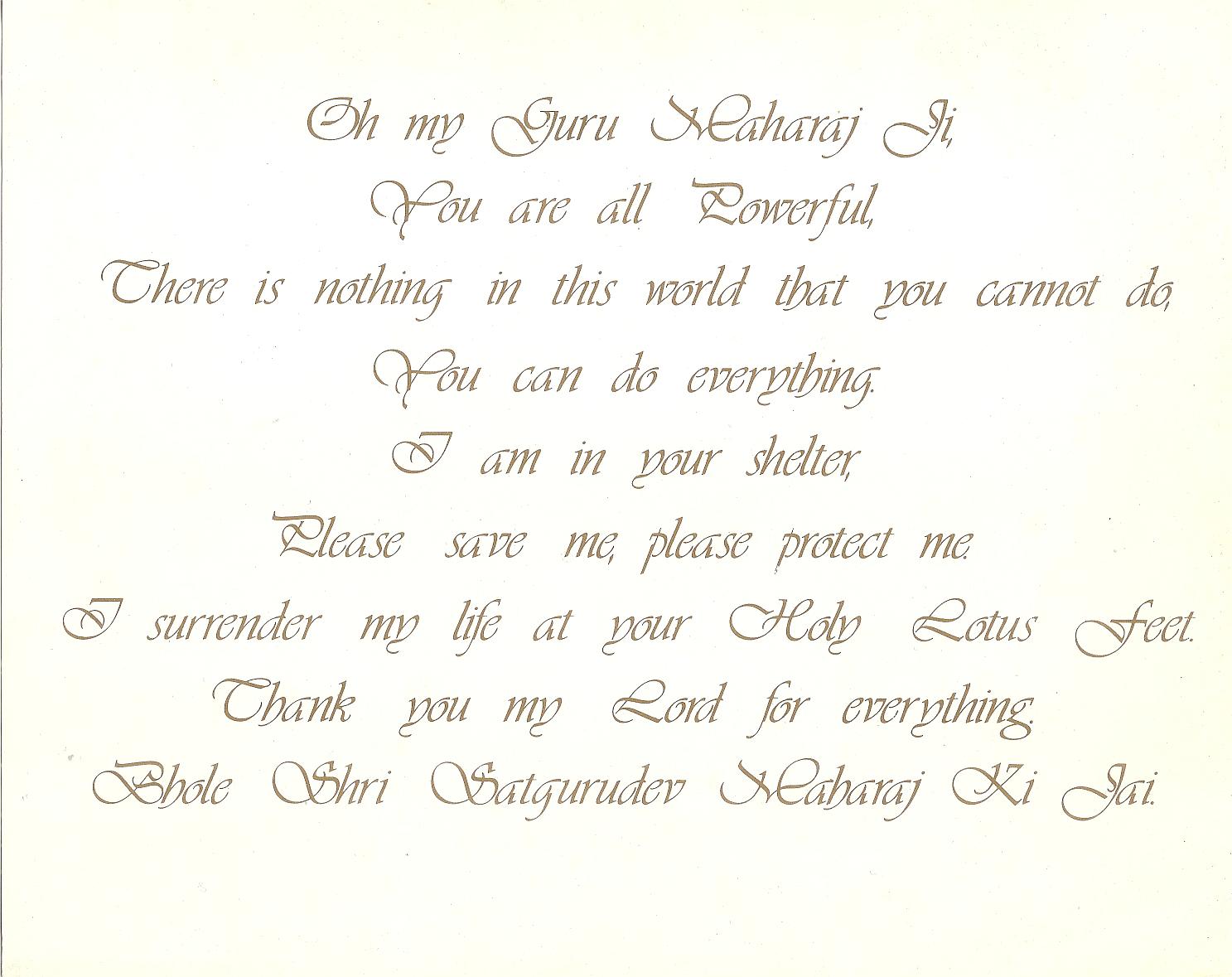 'Oh my Guru Maharaj Ji, I dedicate myself to your lotus feet. I am weak and ignorant and am filled with the impurities of this world. Oh Guru Maharaj Ji, please take my mind and purge me of the impurities I possess. Reveal to me the Knowledge of all Knowledges. Strengthen me, uplift me and reveal the kingdom of heaven within inside of me. Bring me from hate to love, from darkness to light, death to immortality. I will OBEY you implicitly and will never reveal this knowledge to anyone for any reason. I will keep in contact with you through my DEVOTIONAL LOVE, satsang, meditation and service. Thank you my LORD for everything.'