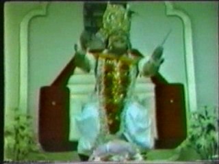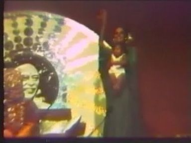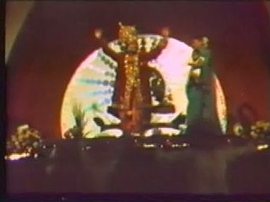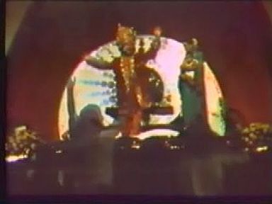 India, 1988, the Birthday Gift film. A full moon satsang ends with the Lord dancing (only just) while many of his devotees, especially up front near the stage, dance deliriously and then it ends with Rawat's head dissolving into the Divine Light on stage. Now that's not something you see every day.