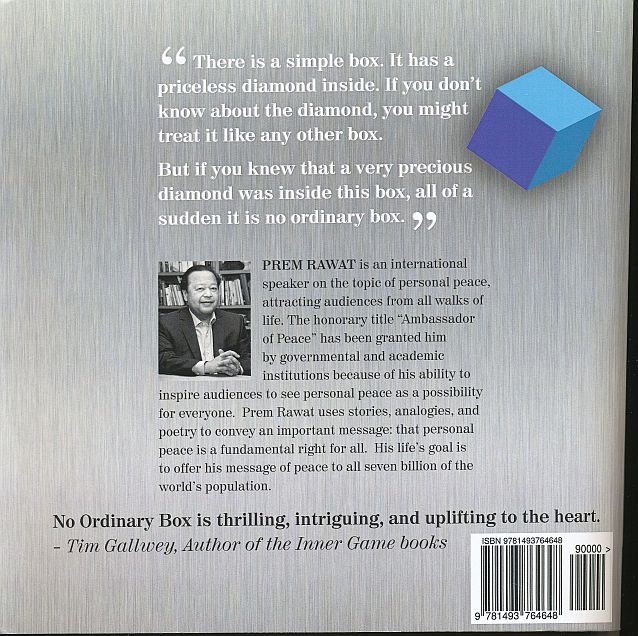 No Ordinary Box is a compilation of extracts of Prem Rawat's recent (2013) speeches edited by the indefatigable but aging Ole Grübaum. It is an ADI book published by Words of Peace Global. It is similar in concept to The Greatest Truth Of All with many quotes from the text highlighted with large fonts and bold print in an attempt at an edgy, urban look. Click here to see these selected highlights, hopefully that won't break copyright rules.