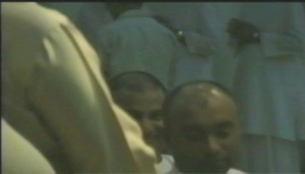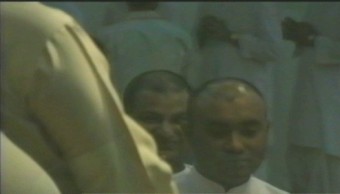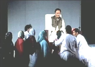 Scenes of darshan at Millenium 73. Prem Rawat wrote to his followers that Millenium '73 was going to be " the most Holy and significant event in human history". Rawat is giving Holy Breath.