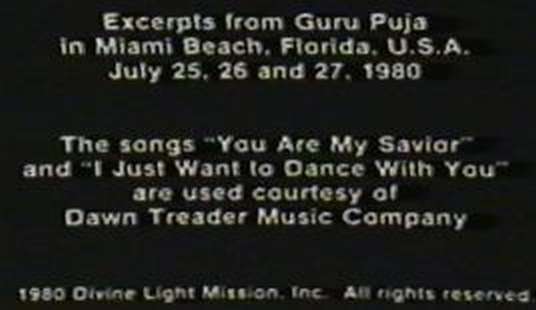 This video titled "Guru Puja '79" was filmed, no surprise, at the 1979 Guru Puja festival at Miami, Florida on July 19, 21 & 22, 1979. It contains some different scenes of Prem Rawat dancing, encoring his dancing and "sharing satsang" ie giving impromptu speeches in his inimitable style and surprisingly unpleasant shouting. Unfortunately, age has diminished the quality of the picture and sound though everything is completely legible.