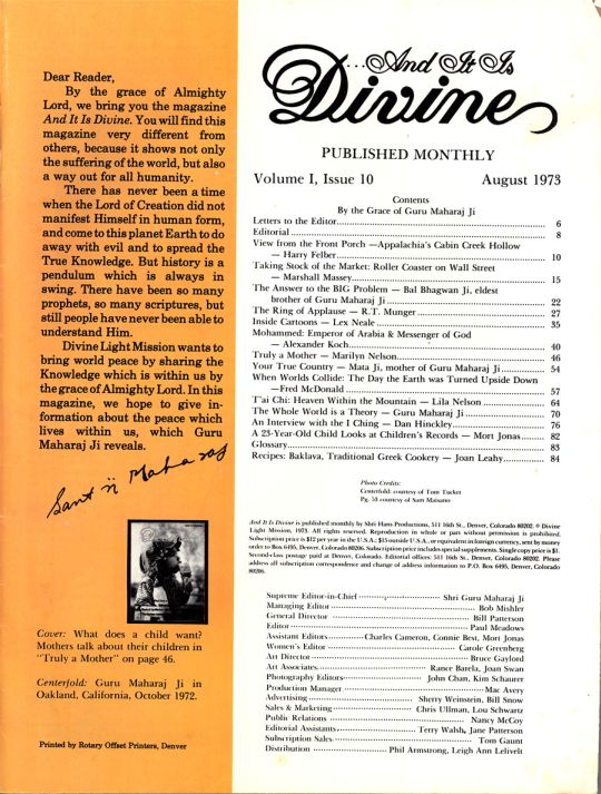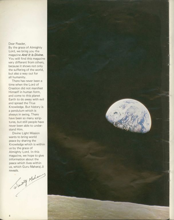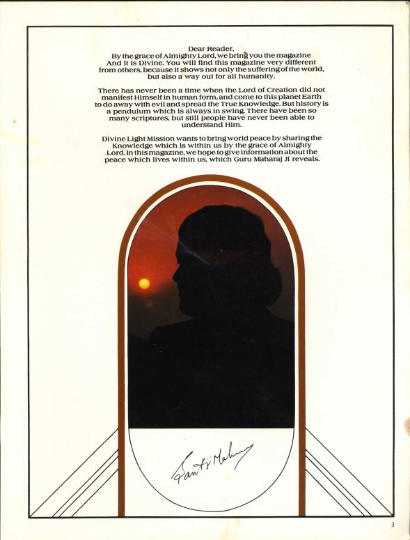 The magazine "And It Is Divine" was a glossy monthly with intellectual pretensions of a weird 60's hippie/paranormal flavour that was published by Divine Light Mission in the US in the 1970s. The magazine had the following message from Prem Rawat (then known as Guru Maharaj Ji and signing with his childhood name 'Sant Ji'), usually printed on the inside cover, until at least March 1975. Most copies of the magazine were destroyed in the early 1980's on the orders of Prem Rawat. OCRed reproductions of scans of many of these And It Is Divine magazines are available on-line at this site.