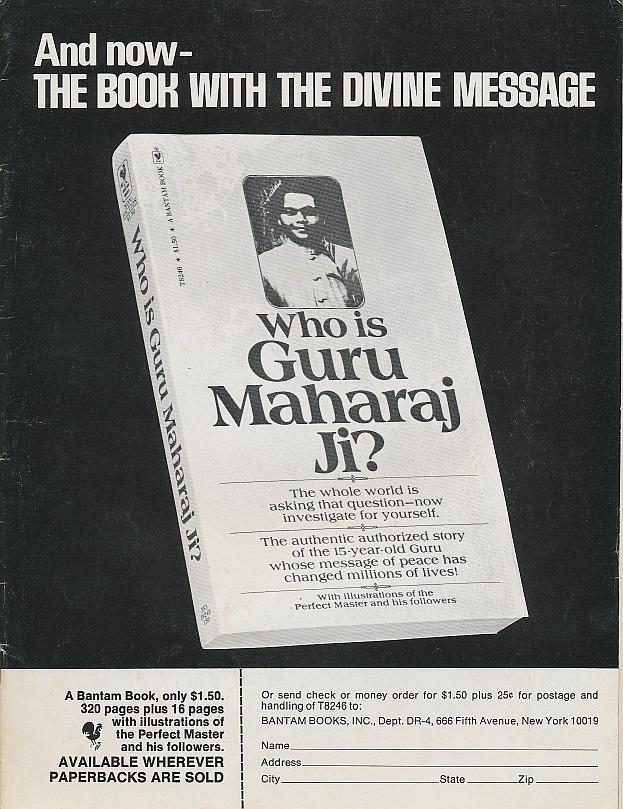 "Guru Maharaj Ji is remarkable. A fifteen-year-old who comes from the foothills of the Himalayas, he already has a group of doctors working to organize a hospital along lines which he has suggested. Thousands of drug users have kicked their habits as a result of his teachings. Senators congratulate him. The blind tell us he has given them inner sight. And he proclaims that he will feed the hungry and bring peace to all who ask."