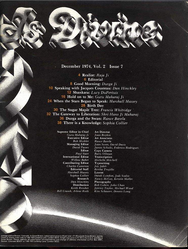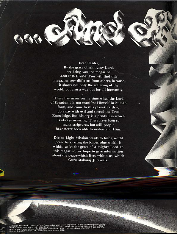 "And It Is Divine" was the name of this colour magazine published by Divine Light Mission in the USA from November 1972 until the late 1970's when it was replaced by "Élan Vital." It began as a monthly magazine with highbrow pretensions attempting to carry a wide spectrum of articles relating to the wider alternative culture and ended the same as all other Divine Light Mission magazines printing pictures and speeches of Prem Rawat's or his immediate family or close followers.