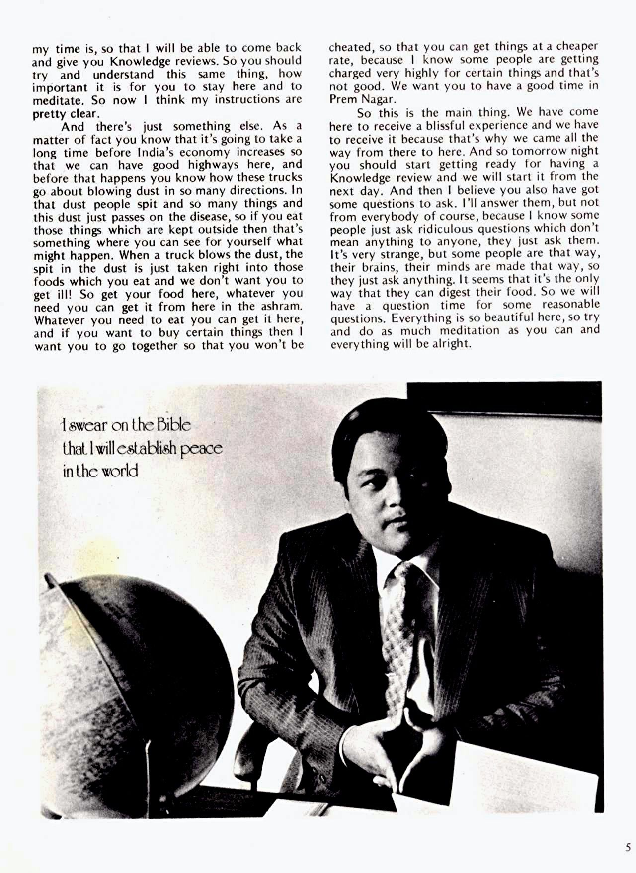 And there's just something else. As a matter of fact you know that it's going to take a long time before India's economy increases so that we can have good highways here, and before that happens you know how these trucks go about blowing dust in so many directions. In that dust people spit and so many things and this dust just passes on the disease, so if you eat those things which are kept outside then that's something where you can see for yourself what might happen. When a truck blows the dust, the spit in the dust is just taken right into those foods which you cat and we don't want you to get ill! So get your food here, whatever you need you can get it from here in the ashram. Whatever you need to eat you can get it here, and if you want to buy certain things then I want you to go together so that you won't be cheated, so that you can get things at a cheaper rate, because I know some people are getting charged very highly for certain things and that's not good. We want you to have a good time in Prem Nagar.