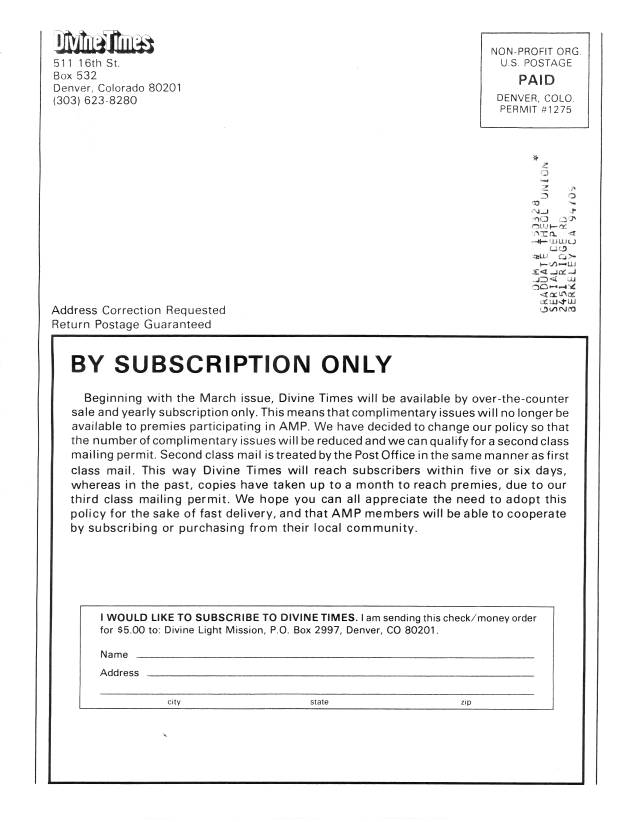 The birthday happened. It was really beautiful; Maharaj Ji was really excited because he felt the love of premies. Then after that, things started changing. We didn't have any meetings; I just spent time doing really simple service. And Maharaj Ji was just doing really simple things, relaxing and resting. Every now and then he'd call Mike Dettmers and me in to talk about the Mission and some of his feelings. And probably four days after that, one evening, he called me in and told me he wanted me to do the service of National Coordinator. He said he'd get together with me right away and go over what that meant. But we didn't get down to any specifics until after Atlantic City. It was such a beautiful thing to see how Maharaj Ji worked. Because a lot of the time that he spent out in Malibu was relaxed, yet he was working all the time. He was really reading the hearts of premies. He's already done the things that were most needed.