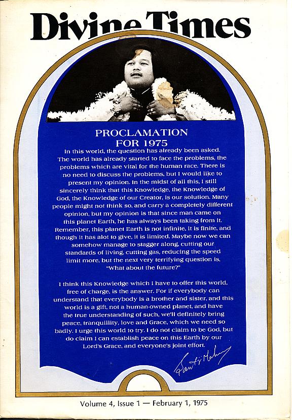 As of early 2012 we have a good sample of the USA Divine Times magazine available from beginning 1973 to 1980. Hopefully, a larger and earlier sample will one day be available. If you have any please contact us
