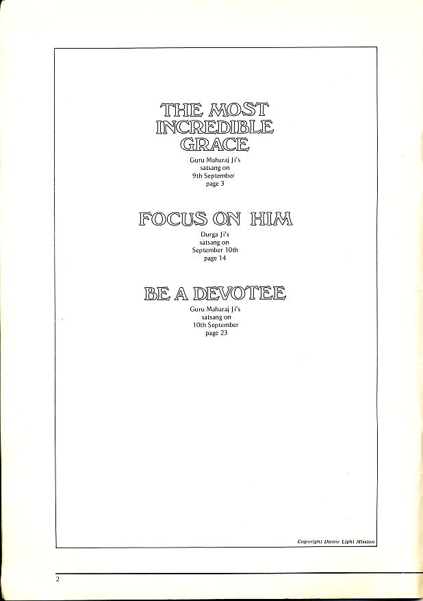 Another speech from this festival delivered on the 8th September, 1978 was published in the Austalian Divine Light Mission magazine, The Golden Age and is available on the internet as An Incredible Creation.