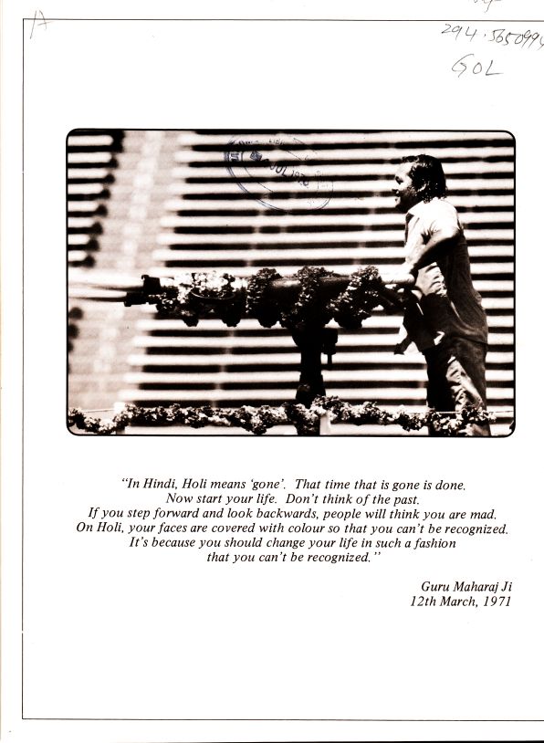 On the final evening of Holi in Miami, Guru Maharaj Ji seemed to bring all the premies into the intimacy of his livingroom. He stood beneath the stage in front of Durga Ji as she gave this satsang, whispering instructions to her. Then Premlata and Hansi were sent to play onstage, before Maharaj Ji himself gave satsang.