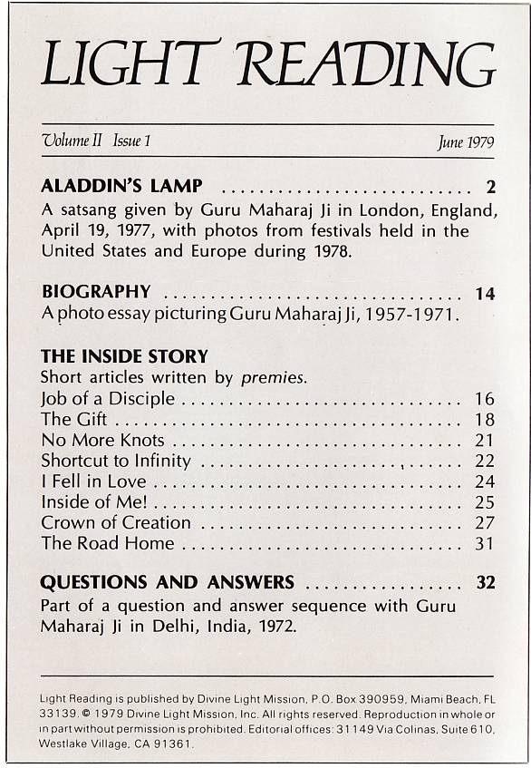 Light Reading is published by Divine Light Mission, P.O. Box 390959. Miami Beach. FL 33139.