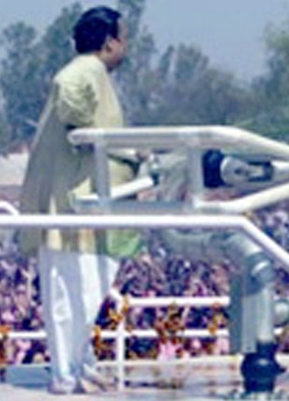 However, Divine Light Mission, Élan Vital, Words of Peace Global and whatever Prem Rawat names his organisations are cults based around one Divine Supreme Leader and so rather than interact with each other, his followers stand, shoulder to shoulder in anonymous crowds and await their Master spraying them from atop a huge throne-like stage. Their practice of Holi is a quintessential example of their practice of "Knowledge". And you know what they say about really short, really fat men who need to have really, really big guns …