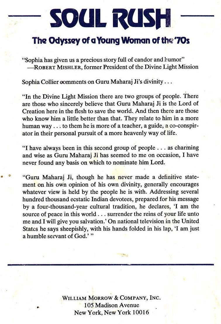 Much of the book is taken up with attacks on Rawat's mother and eldest brother whom she blames for nearly all of DLM's and the young guru's troubles. DLM's period of success ended and the troubles really began once they returned to India so I'll ignore all but the most egregious of those comments. Sophia accepted Rawat's deception of his family and his followers, his laziness and his materialism and his alcohol abuse but she didn't understand what the guru was teaching and the direction he wanted Divine Light Mission to go. She was too independant to be socialised into the Divine Light Mission cult and, although she appears to have little insight into her situation or the guru, the book still contains much useful information about Divine Light Mission from mid-1973 to March 1976 when she finally had enough and went on to new experiences. Sophia usually refers to the guru as "Maharaj Ji" (Sir Ultimate Ruler). I consider this an unwarranted title so I usually refer to him as Rawat, his surname equivalent or Guru Maharaj Ji, the name under which he was best known. Sophia Collier has a Wikipedia page as does this book.