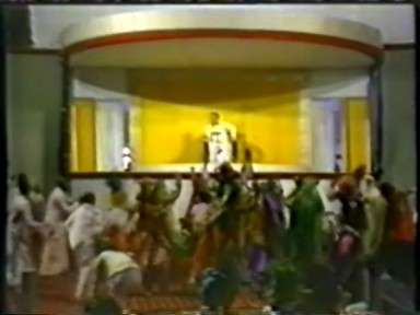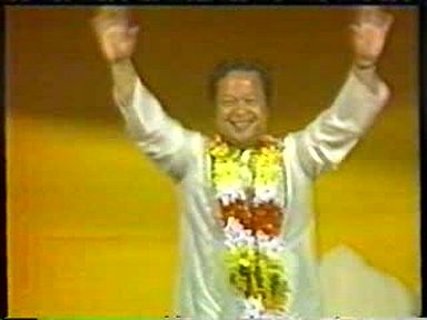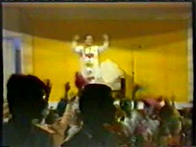 Full moon satsang ends with the Lord dancing (only just) while many of his devotees, especially up front near the stage, dance deliriously and then it ends with Rawat's head dissolving into the Divine Light on stage. Now that's not something you see every day. The ultimate "Golden Donut"
