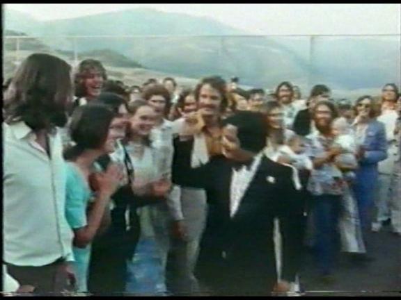 There was a party at Rawat's Malibu mansion for 1,000 premies on Father's Day in mid June 1975. Rawat greets his pet doggie at the front door.