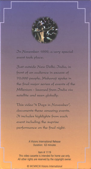 It contains the 'Blessing of the Master' sermon, Maharaji dancing briefly, a Holi festival where some people are collecting the charanamrit and a