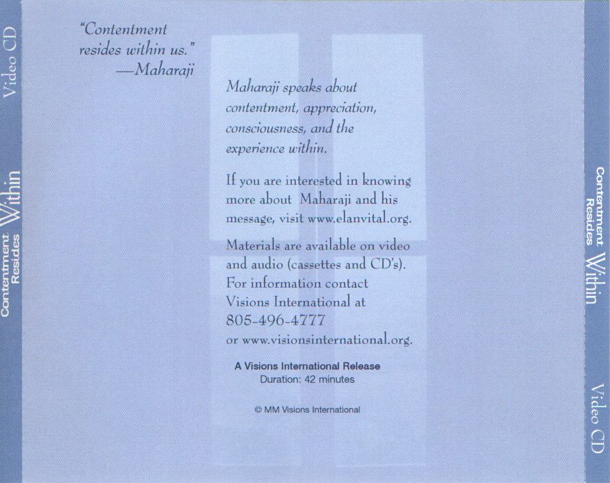 Contentment Within, a Visions International (a division of Élan Vital Inc) release, was released in 2000. It is a VCD of the 42 minute long speech Rawat gave in Denver, Colorado on March 2, 1994. His pronunciation was still a little shaky on the 'w' which he pronounced 'v' and he still said 'wissdom' instead of 'wisdom' and his voice often became shrill and loud. His mature style was already fully developed.