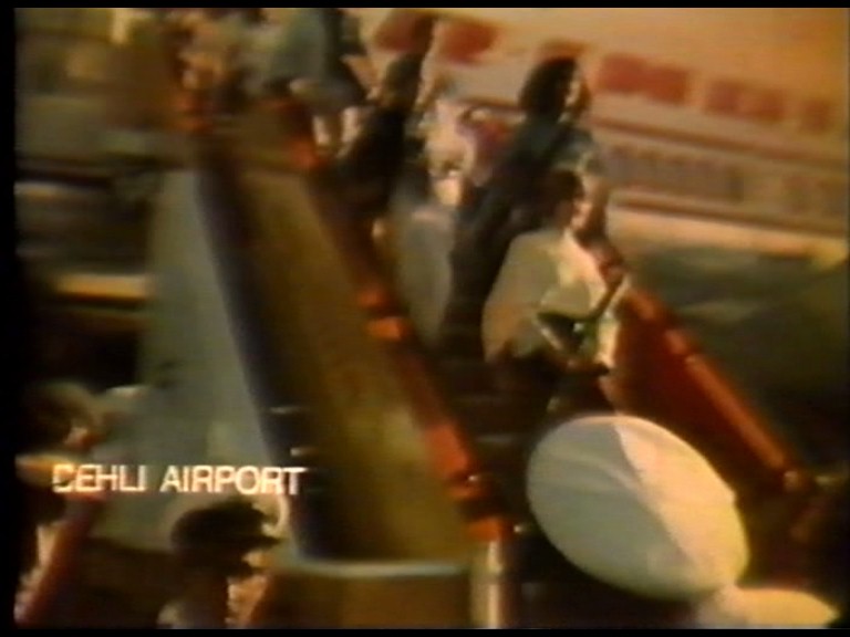 Scenes of the young Rawat arriving at London airport. Premies run to crouch down and pranam and touch his feet as he passes by.