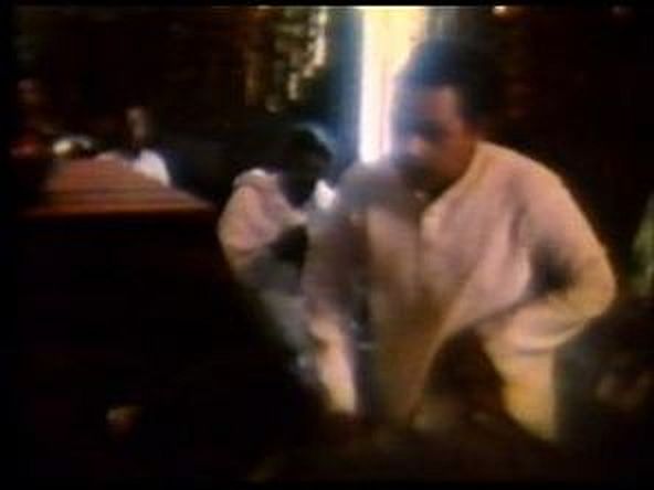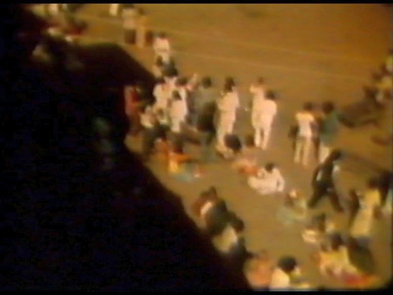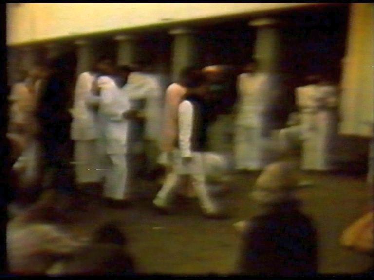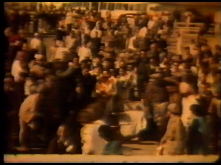 Rawat flies in later so the Western devotees can be seen to greet him at the front of the huge crowd. (soundtrack: bagpipe instrumental of Amazing Grace)