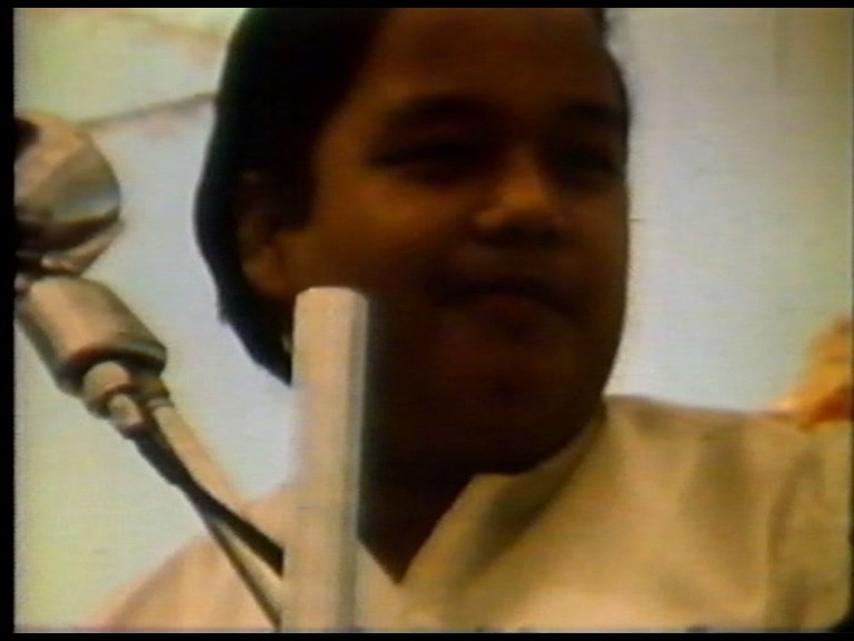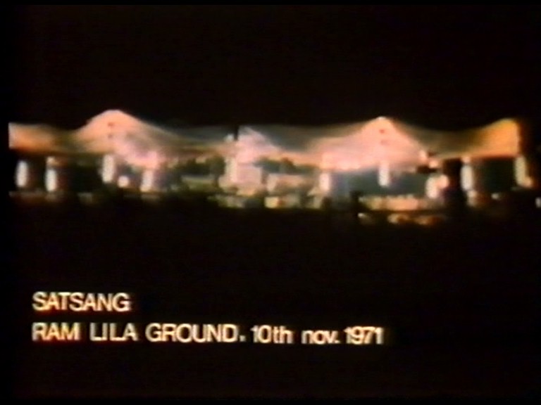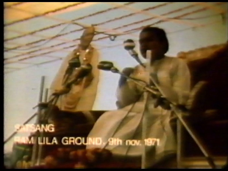 Hans Jayanti festival, Ram Lila grounds, Delhi, 10th November, 1971. Many Hindi acclamations followed by crowd shouting Ki Jai. The young Rawat gives satsang in Hindi followed by crowd singing of bhajans while guru chews reflectively.