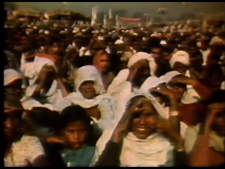 Voice over: From every corner of the world devotees have gathered to sing and praise the glories of Guru Maharaj Ji who they call the Saviour of Mankind. People of all nationalities and religions are here to show their love and devotion to the young Master who has shown them the way to transcend all differences of caste, colour and religion. Here Hindu and Muslim, black and white, rich and poor, have all come together in total brotherhood having realized the one universal father dwelling within all hearts.
